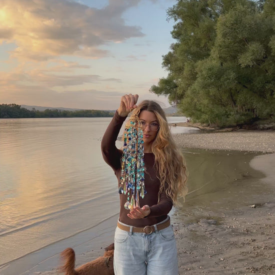Kézműves szélcsengő kék színben. Ez az egyik legtöbb órás munkám + a legtöbb alapanyagot igénylő is. Nagyon látványos Napfogó / szélcsengő, amit nagy izgalommal készítettem el. A végén feldobtam még több aranyozott / holddal és nappal, csillaggal , réz csillingelő haranggal és lótusz medálokkal is. Sokáig tartott amíg össze válogattam a megfelelő egymáshoz illő kék/átlátszó üveg gyöngyöket és megtaláltam a megfelelő alapanyagokat is hozzá. 🧚♂️✨🌿 Ezt a szelcsengőt teraszon is lehet használni és házban is egyaránt. Garantáltan rengeteg szivárványt fog szórni a környezetébe. Igazi varázs hangulatot áraszt✨